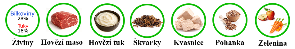 Ručne miešané krmivo so sušeným hovädzím mäsom, hovädzím tukom a mletými lojovými škvarkami. Krmivo je charakteristické rovnako ako hovädzie krkovice svojou skvelou chuťou, vôňou a "šťavnatosťou" vďaka obsahu škvarkovej pasty s hovädzím tukom. Zmes má veľmi vysoký podiel živočíšnych surovín a minimum surovín s obsahom škrobu. Bez klasických obilnín, z bezlepkových surovín, bez hydinového i rybieho mäsa i tuku, s vysokým obsahom prirodzených „superpotravín“, ktoré zaistia ideálny pomer organických, vysoko stráviteľných vitamínov a minerálov. Priemer peliet je 16 mm čo je univerzálna veľkosť pre všetky druhy psov. Ideálne krmivo pre psov neznášajúcich rybinu alebo zlé a vyberavé jedákov - hovädzí tuk totiž presvedčí každého "nežravca". Pelety sú tvrdé ale krehké, vo vode nebobtnajú a majú hrubozrnnú štruktúru. Bez soli, konzervantov a posilňovačov chuti! Podrobné informácie sú v "Popise výrobku". viac